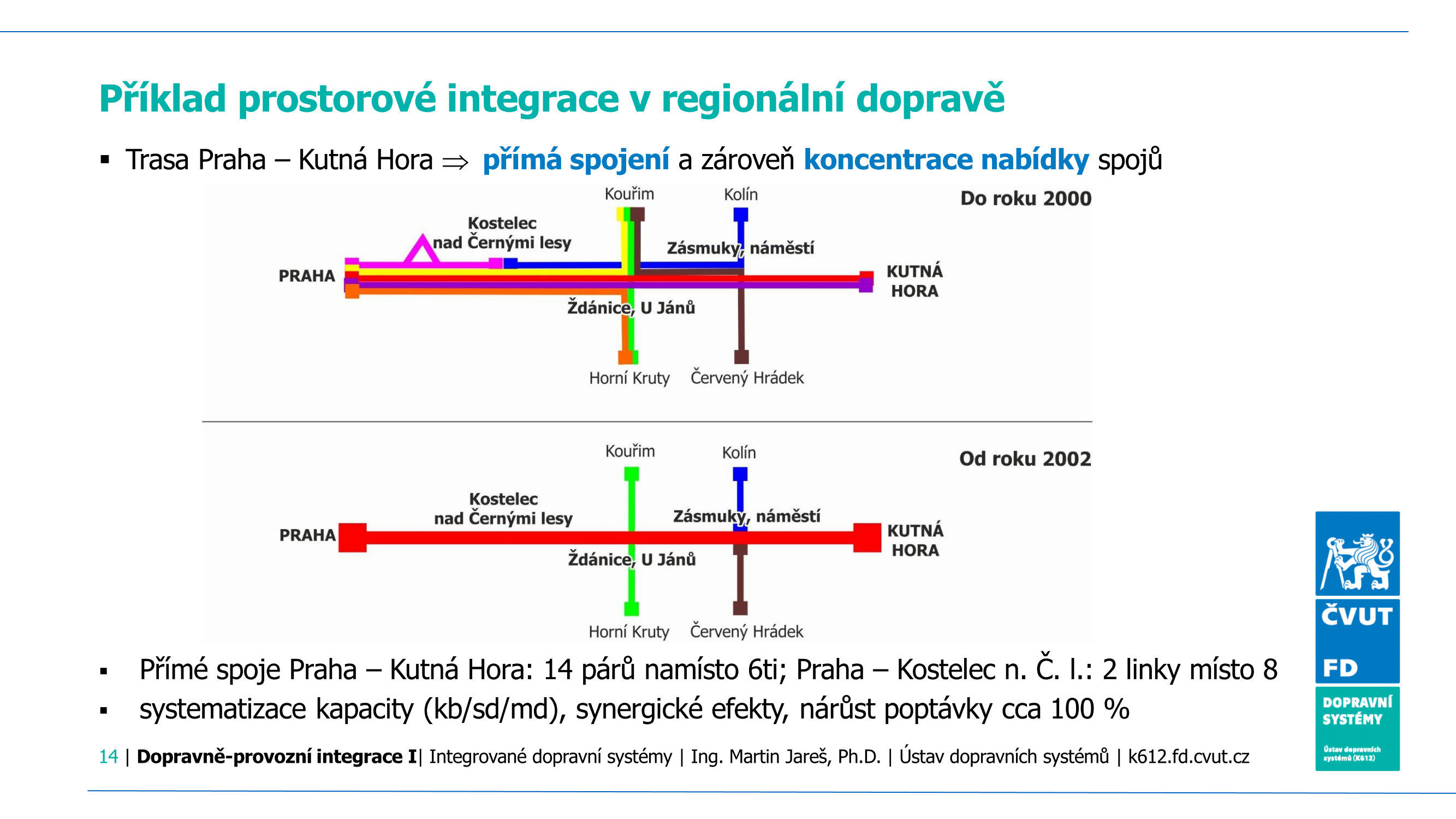 V Kutné Hoře si občané i úřad přejí moderní a kvalitní dopravu, která slouží cestujícím. Integrace umožní propojit původně příměstské a městské linky. Jako příklad lze uvést dnešní linku F16 Kutná Hora-Kolín a linku MHD 17 celnice-aut.st.-Kaňk. Tyto dvě linky lze spojit v jednu, a to připravovanou linku 805. Propojíme tak oblast Karlova, aut.st., sídliště Šipší, Kaňku a Kolína. Nově tak budou moci pracující v Kolíně či v Praze při přestupu z vlaku sednout na autobus na kolínském nádraží a dojet až na kutnohorské sídliště či Karlov. Omezíme zbytečné výdaje na linku 17, která z důvodu nízkého využití je velmi nákladná na provoz a tvoří zbytečné přejezdy. Ušetřené prostředky investujeme do nových častějších spojů.